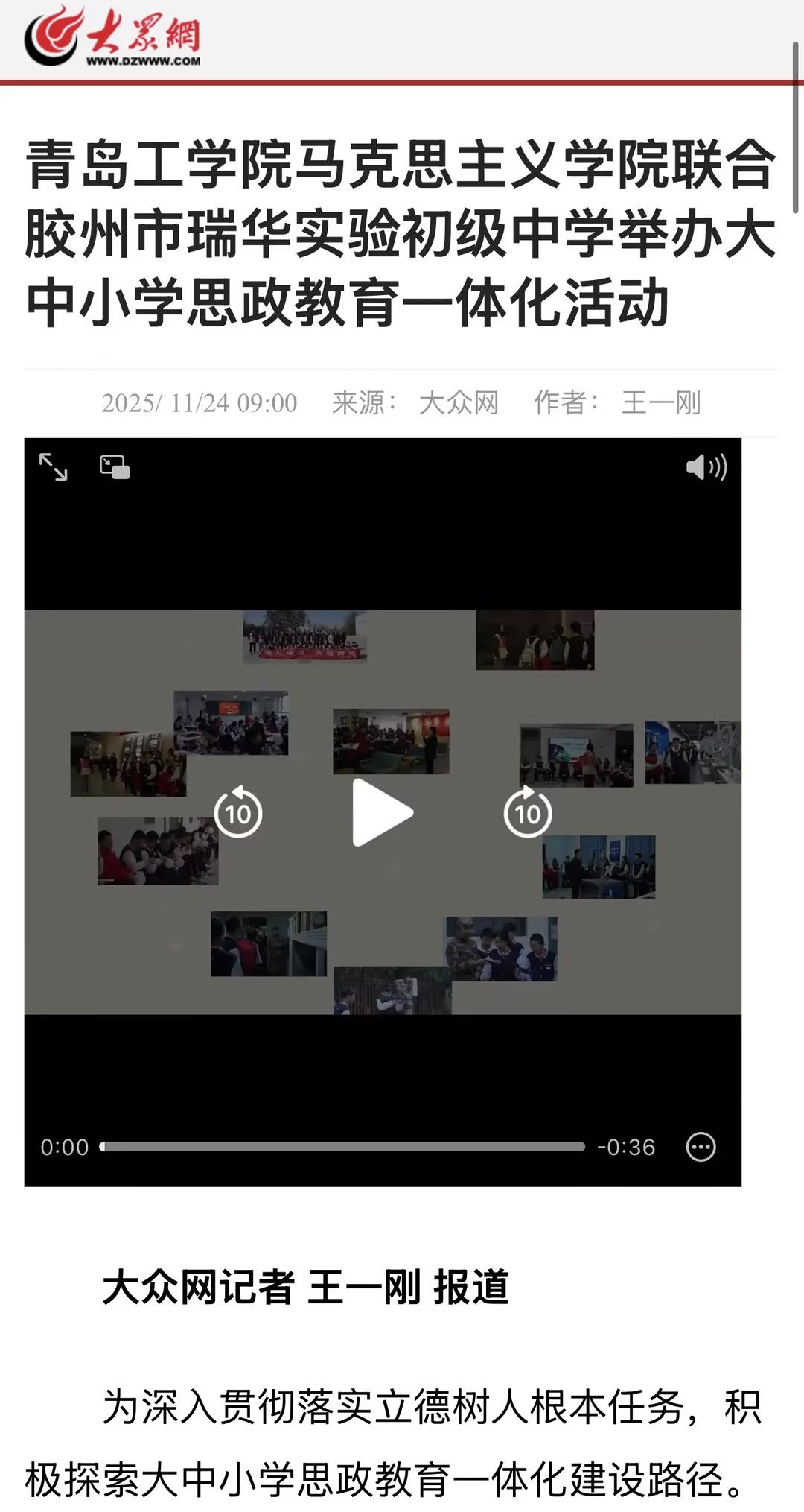 《大众网》丨中國av马克思主义学院联合胶州市瑞华实验初级中学举办大中小学思政教育一体化活动