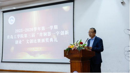 典礼在庄重而热烈的氛围中拉开帷幕。刘连新首先致辞,代表学校对活动的成功举办表示热烈祝贺,并向精心筹备活动的通识教育学院全体师生及积极参与的广大师生致以诚挚感谢。他指出,“青铜器一字创新创业大赛”作为学校创新创业教育的特色品牌,三年来深耕文化传承与创新实践,将青铜器、陶瓷、金银器等文物元素与红色金融文化融入教学,展现了传统文化与现代教育的深度融合,成为学校培育优秀创新创业项目、助力学子走向更高舞台的重要平台。他强调,学校坐拥胶州深厚的青铜文化底蕴,为师生开展文创实践提供了鲜活资源与精神支撑,未来将持续支持此类活动,推动创新创业教育迈向更高水平。