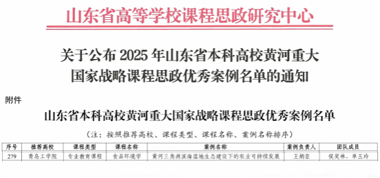 近日,山东省高等学校课程思政研究中心正式公布2025年山东省本科高校黄河重大国家战略课程思政优秀案例名单。食品工程学院王炳臣老师主讲的《食品环境学》课程案例——“黄河三角洲滨海湿地生态建设下的农业可持续发展”成功入选。这一成果是学院深化课程思政教学改革、推动国家重大战略与专业育人融合的重要体现,充分展示了学院在应用型食品人才培养领域的扎实工作与创新成效。